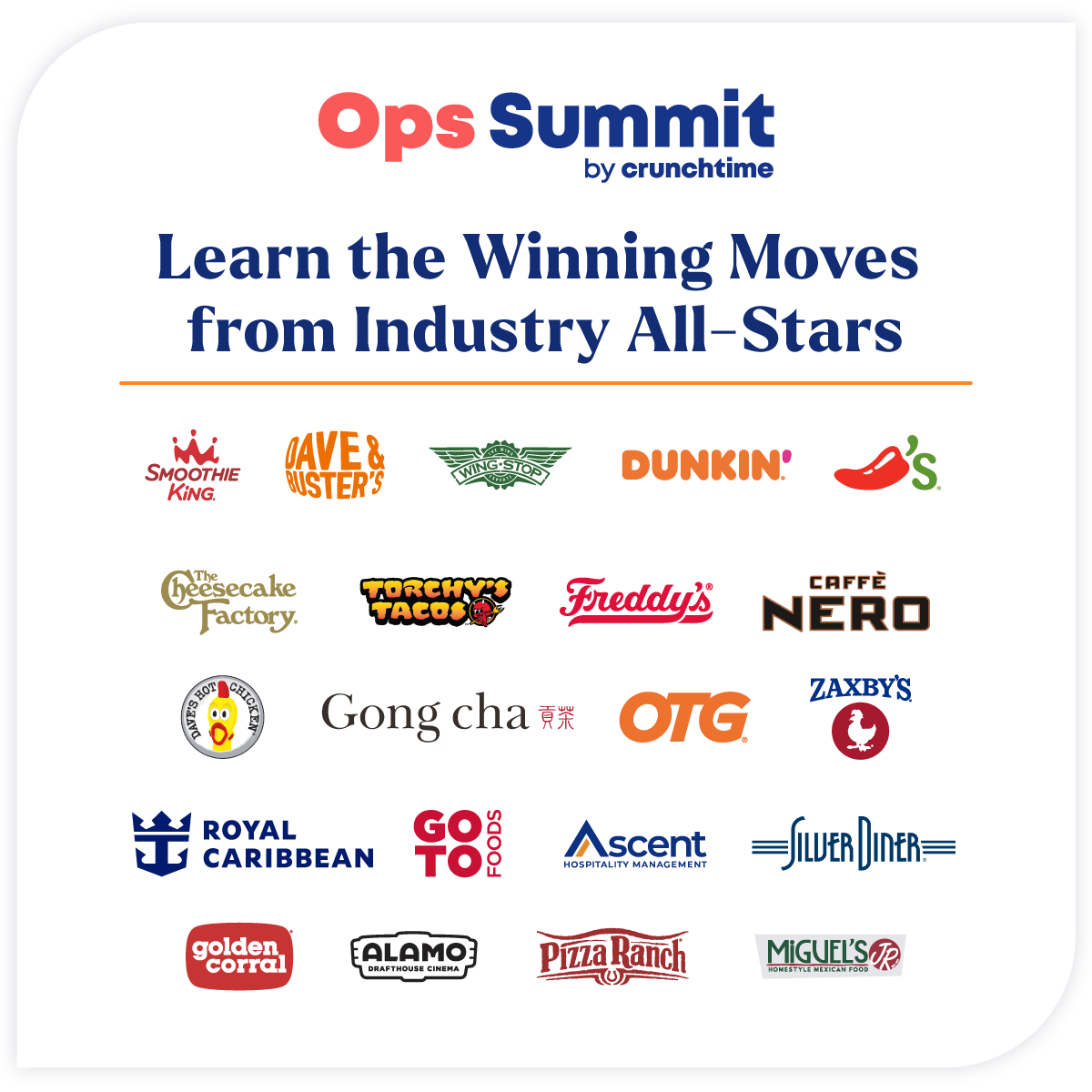 Join this all-star lineup of customer presenters, panelists, and featured speakers to go pro at Crunchtime’s Ops Summit, March 16-18, 2026, in Arlington, Texas!